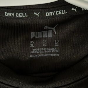 This black Puma tee features a minimalist design with a large outlined Puma logo on the front. Made from a comfortable cotton blend, it offers a classic crew neck and short sleeves, perfect for everyday wear. Great condition. Measurements: