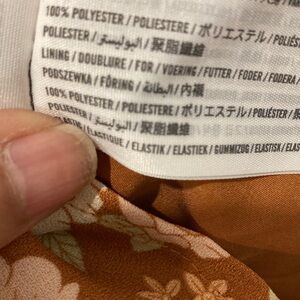 Stylish mini dress with floral pattern. Features a warm brown base with cream and pink flowers. Adjustable shoulder straps