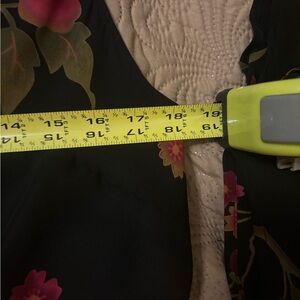 Elegant black silk dress with rich magenta, olive, gold, and maroon floral pattern. Perfect for any occasion. 2 Pieces. Can be paired with a black blazer.