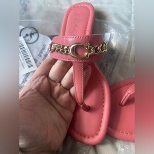 Elegant Coach sandals in a striking pink. Features a stylish gold chain detail.