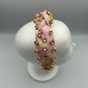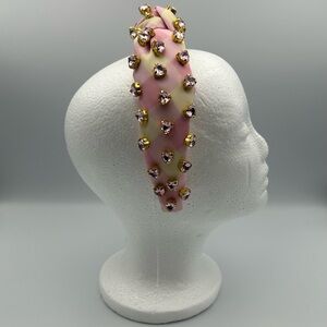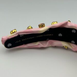 Lele Sadoughi X Stoney Clover Lane Watermelon Gingham Heart Crystal knotted headband. Features a soft pink and cream gingham pattern. Decorated with beautiful gold-toned and soft pink heart crystals. In good pre-owned condition. Please note some flaws: on the right side of the headband on the outside there is a few tiny stains, and on the inside of the headband at the top where the knot is there is light makeup marks. The above noted flaws are shown in the product images displayed. This specific headband is no longer available on the official Lele Sadoughi or Stoney Clover Lane website. Comes with Lele Sadoughi black and cream striped dust bag for storing (not the original dust bag for this headband collaboration). Please let me know if I can answer any questions about the headband prior to ordering!