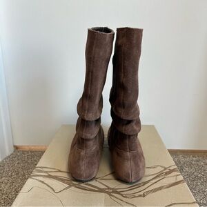 These boots are new with the box. They are a dark brown suede with a draped detail. They are about mid calf height.