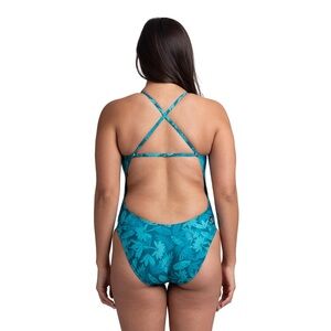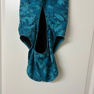 Stylish teal one piece swimsuit. Features a leaf pattern. Perfect for swimming and beach days.
