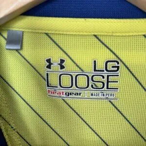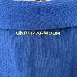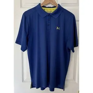 This is a men's Under Armour polo in royal and yellow colors, size large with a loose fit. It is part of the Under Armour HeatGear product line and is designed for performance wear. The polo features a royal theme and is made for regular size.