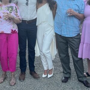 Worn once! Slight wine spill on cape but dry cleaned so appearing very light. Currently sold out. Beautiful ivory color