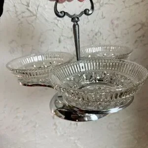 This mid-century modern set features a rotating chrome stand with an elegant handle and three pressed glass bowls showcasing: