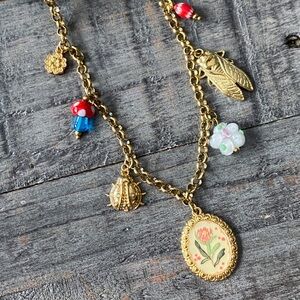 NEW Gold Insect Charm Necklace With Floral Pendant