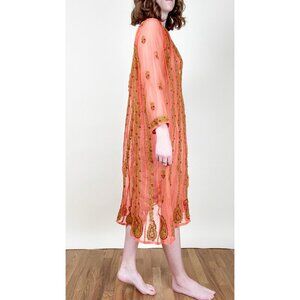 Stunning Vintage Embroidered Swimsuit Cover Up Floral Sheer Mesh Coverup Coastal Beach Boho Brand: No tags looks to be handmade Date: 1970s - 1980s Features: Deep plunge front v-neck, long sleeve, embroidery throughout Colors: Light peach pink orange, green, and red floral paisley Composition: No tags but can is a sheer chiffon silky material Size: No size tag but can fit a modern size L, M, or S depending on your desired fit. For reference, I am usually a size Medium Condition: Excellent pre-owned vintage condition. No visible flaws and very minor wear Style Tags: Vintage, Retro, 70s, 70’s, 80s, 80’s, 90s, 90's, Preppy, Coastal, Beach, Resort, Resortwear, Vacation, Travel, Lounge, Loungewear, Athleisure, Coastal Grandmother, Grandma, Granddaughter, Nautical, Light, Lightweight, Tropical, Surf, Mermaid, Mermaidcore, White Lotus Aesthetic, Funky, Fun, Bright, Bold, Statement, Saturated, Rainbow, Artsy, Art, Indie, Playful, Maximalism, Flamboyant, Vibrant, Disco, Whimsical, Whimsigoth, Gothic, Victorian, Fairycore, Fairy, Mermaidcore, Mermaid, Princess, Royal, Story Book, Fantasy, Romantic, Cute, Twee, Bridgerton, Regency, Hippie, Bohemian, Boho, Rustic, California, Free Spirited, Gypsy, Natural, Flowy, Relaxed Fit, Oversized, Lagenlook, Festival, Cottagecore, Peasant, Tomato Girl, Rustic, Milkmaid, Prairie, Grandmacore, English Countryside, Farmcore, Sexy, Trendy, Barbie, Coquette Girl, Surf, Cruise, Swimwear, Tiki Bar, Hawaii, Fun, Bathing Suit, Swim, Cover-Up