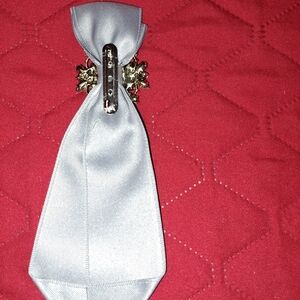 This elegant brooch features a silver satin ribbon with a decorative metal clasp. Perfect for adding a touch of sophistication to any outfit.