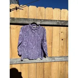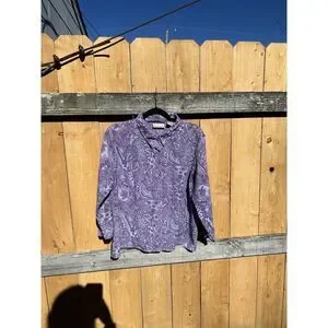 Apostrophe 3/4 sleeve purple paisley button up size XL. Preowned good condition! 100% polyester. 21 in pit to pit, 23 in top to bottom. Ships in 1-3 days 🐙