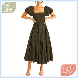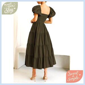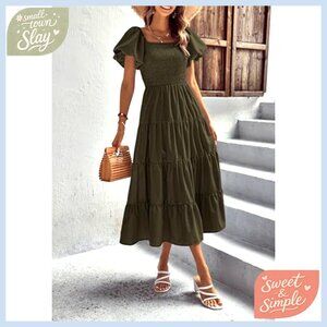Women's Casual Midi Dress Puffy Sleeve Square Neck Smocked Tiered Ruffle