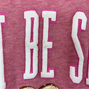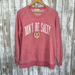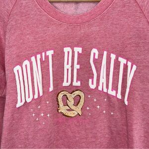 Pink sweatshirt with 'Don't Be Salty' text and pretzel graphic.