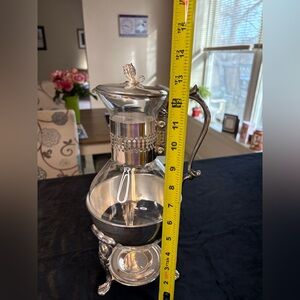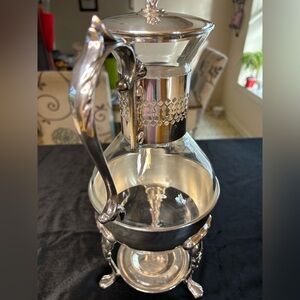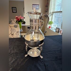 Beautiful silver and glass pitcher with an ornate stand. Perfect for serving beverages in style.