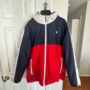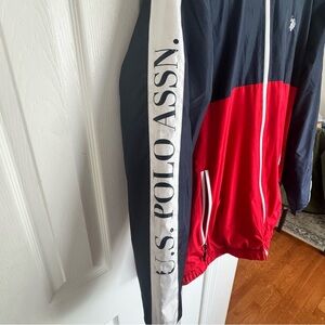 Preowned worned few times. U.S. Polo Assn. (USPA) men's classic polar fleece jacket in size large. This cozy navy blue jacket offers a timeless pullover style with a comfortable, warm polar fleece fabric perfect for layering during cooler weather. Features include a ribbed crew neck, long sleeves, and a straight hem for easy wear. Ideal for casual outings or everyday comfort. From a smoke-free pet-free home.