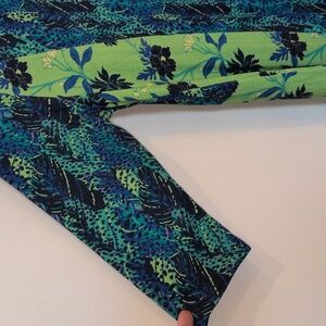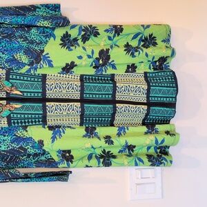 Soft Surroundings Marilla Tunic top in a floral and geometric design. Green and blue colorway with intricate beaded neckline.