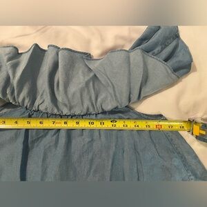 @nannyb1960 Hi! Both great questions. I’ll upload another photo with the spot circled in blue. I’m happy to measure the pit to pit when I get home this evening. Pretty sure it’s elastic underneath too though, as the shoulders are. Yes. It’s super cute off the shoulder. Im a smaller -up-top girl too, but I love that pieces like this give us a little extra up top with the cute ruffle. 😄 I’ll be in touch about that measurement. 👍🏻