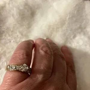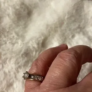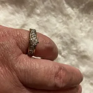 If I was guessing I would say these are diamonds in 10kt gold or gold overlay. My Mother used to buy a lot of diamond rings at Walmart. Marked inside but I can’t read it. I would say it’s a size 6. Some of the finish is worn as shown.