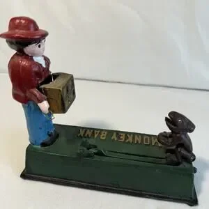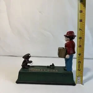 This vintage cast iron jumping monkey coin bank is a rare find and a great addition to any collector's display. With its mechanical design, this bank is not only functional but also visually striking. The detailed craftsmanship and sturdy construction make it a durable and long-lasting piece that is sure to be a conversation starter in any collection.