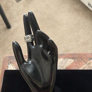 Finish: The sterling silver is oxidized. This intentional darkening highlights the intricate detail of the "intertwined" or "woven" root-like design on the band.