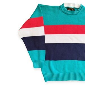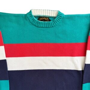 Vintage Eddie Bauer cotton knit sweater features a bold horizontal block stripe pattern in teal, red, white, and navy blue. This heavyweight crewneck pullover is crafted from 100% cotton, offering a comfortable and breathable feel suitable for year-round wear. The ribbed collar, cuffs, and hem provide a classic structured fit.