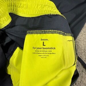 Bird Dogs men's navy blue jogger pants in size L. Designed for performance and an athletic fit, these joggers feature a comfortable drawstring waist and cuffed ankles for a streamlined look. The interior lining is a vibrant neon yellow, adding a pop of color. Side zip pockets offer secure storage for essentials. Perfect for workouts, casual wear, or travel.