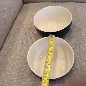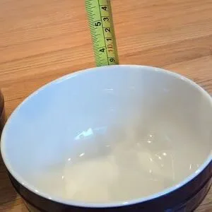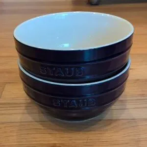 Chic Staub bowls in blue and ivory. Perfect for serving or decor.