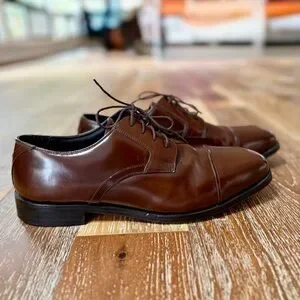 Up your shoe game without breaking the bank, gents. Grab these gorgeous brown leather cap toed oxford lace up dress shoes for a fraction of retail price. In excellent preowned condition.