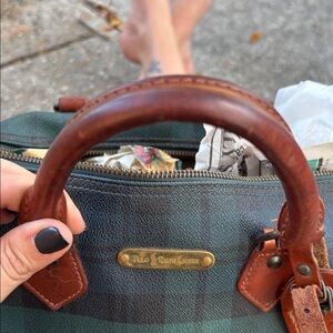 Vintage Ralph Lauren bag with leather handles and details, including leather Ralph Lauren tag. No rub on corners in beautiful condition. Inside interior does have some stains that could be cleaned