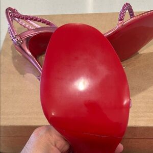 Shimmering metallic fuchsia heels with elegant straps. Signature style from Christian Louboutin. Brand new, with “TOPYed” professionally installed ($65) to protect red soles and prevent slipping.
