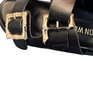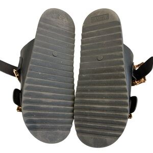Chic black sandals by Jason Wu. Features striking gold accents. Perfect for any casual occasion. Size 7.5 lightweight. Used with one broken buckle on left sandal. Please carefully see pictures for reference. Otherwise good condition offers welcome