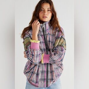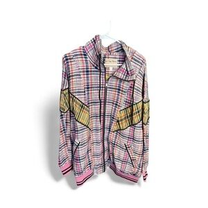 Vibrant plaid jacket with a zip-up front. Features pink and yellow accents.