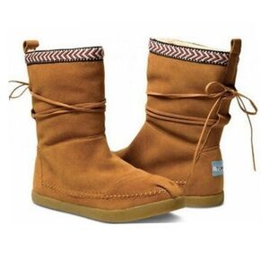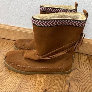 Like new. Stylish brown boots with wraparound laces. Cozy and perfect for winter wear. Features a patterned trim for added flair.