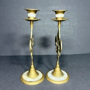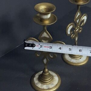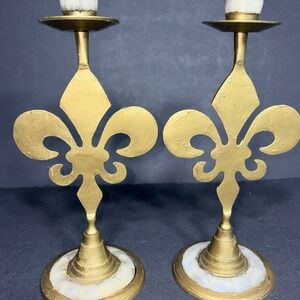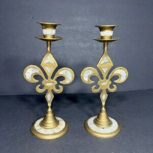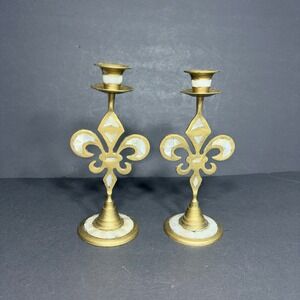 Vtg Brass Fleur de Lis Candlestick Holders Mother of Pearl Inlay Pair 9.5in