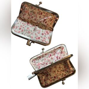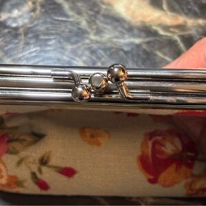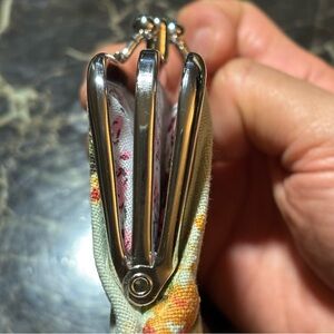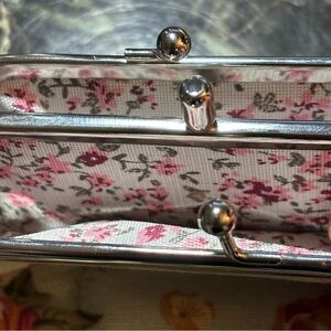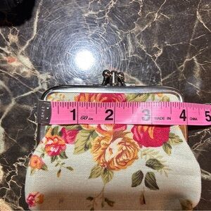 Elegant clutch with vibrant floral pattern. Features red and yellow flowers. Perfect for any occasion. The Vintage Anna Sui Cute Floral Print Coin Purse is a charming accessory designed for women. Made from fabric, this coin wallet features a delightful floral pattern in a multicolor palette, perfect for adding a touch of whimsy to any outfit. The Anna Sui brand, known for its anime-inspired designs, adds a unique and playful element to this wallet, making it a cute and eclectic addition to any collection of women's accessories.