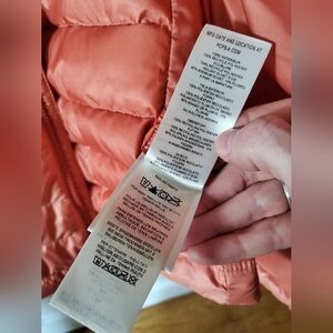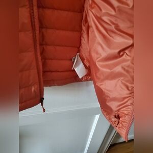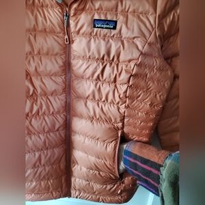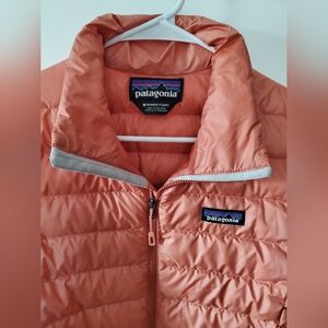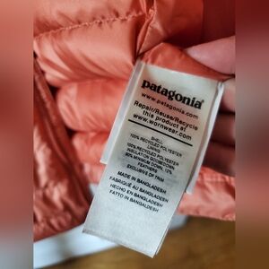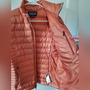 Classic Patagonia down jacket in excellent used condition with no rips, tears, or issues. Women's size medium in impossible to find peach color (code MEMN). Two zip hip pockets, interior cinch at hip, and zippered front with garage to protect your chin.
