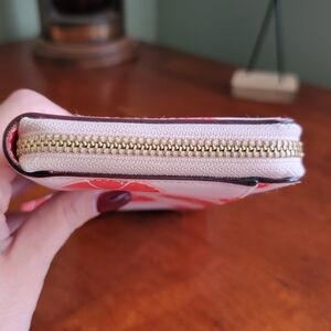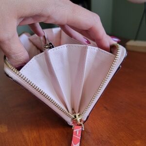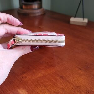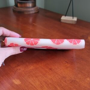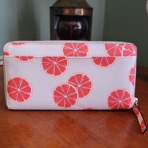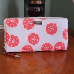 Kate Spade Liberty Street Neda Pink Grapefruit Leather Wallet is Kate Spade style number WLRU2923, made in 2017. Exterior is made of light pink coated canvas with a grapefruit design. Gold-tone hardware and 3/4 zip closure. The interior is a combination of smooth pink leather and Kate Spade two way script logo lining and has 12 card slots, 2 slip pockets, and an interior zipper coin pocket. Has 3 compartments with gusseted leather sides. Slip pocket on the rear of the wallet.