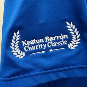 This is a women's Under Armour HeatGear polo in blue, ideal for golf and activewear. The polo is designed with a collared neckline, short sleeves, a loose fit, and made of 100% polyester fabric. It features an embroidered tournament charity design, perfect for a royal-themed occasion.
