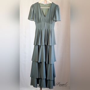 Stunning dark sage maxi dress with beautiful chiffon ruffles. Perfect for parties, weddings, or dances.