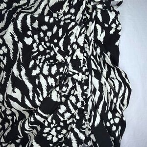 The Veronica Beard Ari midi skirt is a versatile, figure-skimming skirt defined by its signature side ruching and adjustable drawstring. It features a knee-to-midi asymmetrical length, curved hem, concealed zipper and a comfortable waistband. Black and bone (whitish) pattern. Great condition, no flaws.