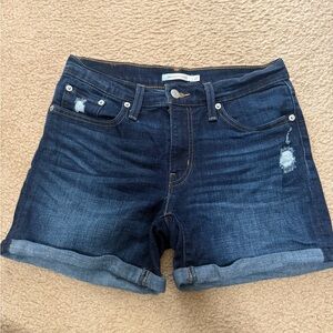 Trendy Levi's jean shorts in dark blue. Features rolled cuffs and distressed details.