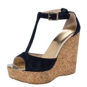 These new Jimmy Choo Wedges are waiting to be to worn on your next weekend getaway! Crafted in Spain, these open-toe designer sandals feature a navy suede leather exterior and a striking cork wedge and platform. A delicate leather t-strap meets with the ankle strap. These impressive wedges can be fastened with the help of a gold-toned logo-engraved square buckle and peg-in-hole closure. Heels 5" with 1.75" front platform.