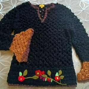 Sas Kia, Los Angeles-Amsterdam, vintage, V-neck, tunic style, crocheted sweater. Size 2, but runs larger. Pit to pit measures 18", length from shoulder to hem 24". Black big-knit yarn body with granny crocheted floral hem and wide sleeves at the wrist. In great condition!