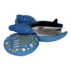 Blue headband featuring a sequin bow and menorah design. Ideal for Disney enthusiasts.