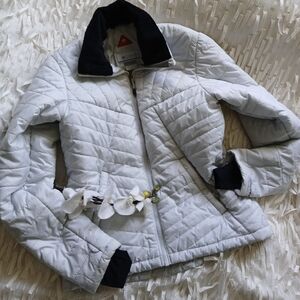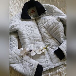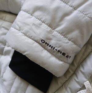 Stay warm and stylish with this elegant white/gray-ish quilted jacket. Columbia Nano Puff Omni-heat jacket. Size M