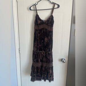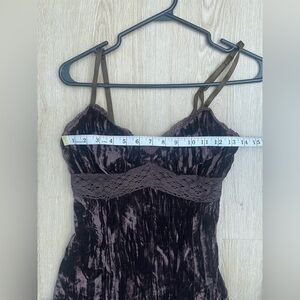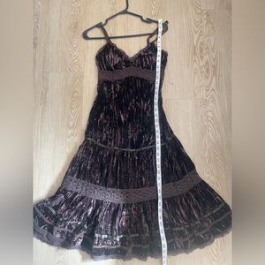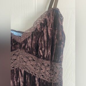 Smart Set velour midi dress in rich brown with pleated texture and lace trim. Soft viscose blend with a smocked back—perfect for whimsigoth, lagenlook, and fairycore styling.