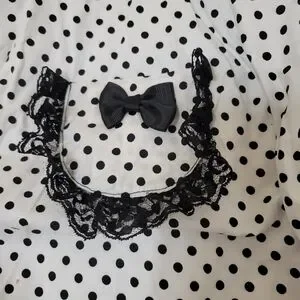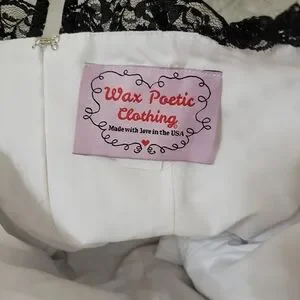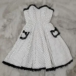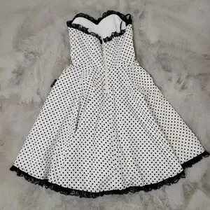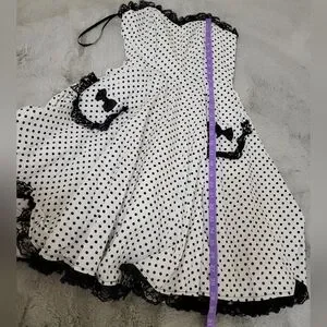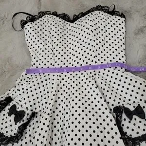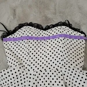 vintage style black and white polka dot strapless dress with lace, wax poetic clothing, made in the usa, has boning in the top, size xs- see measurements, darting in the bust so flat across measurement actually will allow for more, would look great with a petticoat added