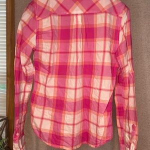 Vibrant plaid shirt with a mix of pink and orange hues. Features a classic button-up design. Like new. Size small