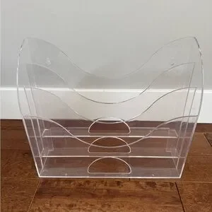 Organize your space with this sleek clear acrylic magazine holder. Perfect for home or office use.