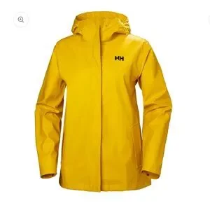Vibrant yellow ski jacket by Helly Hansen. Designed for warmth and style. Ideal for snowy adventures.