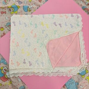 Adorable vintage 1990’s baby blanket with lace💗 soft pink on one side and multicoloured baby foot prints on the other🥹